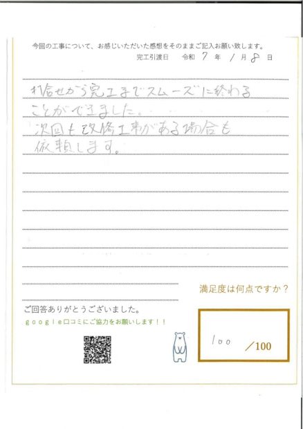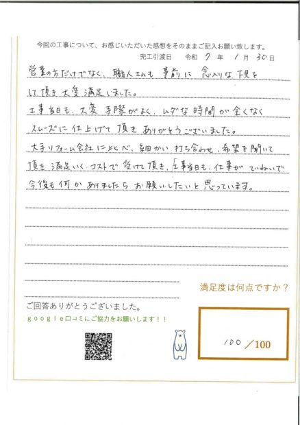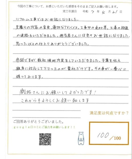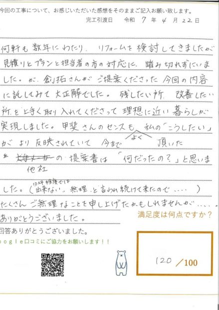 数社にわたってリフォームをご検討される中で、当社にご期待を寄せてくださり、大変光栄です。