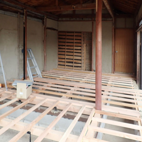 段差を無くす為、広縁の床、畳床すべて解体・撤去し、床の下地材を敷き直しました。新しい床の仕上げ材は、車いすのタイヤ擦れにも耐えられる汚れに強い複層ビニルシート仕上げとしました。