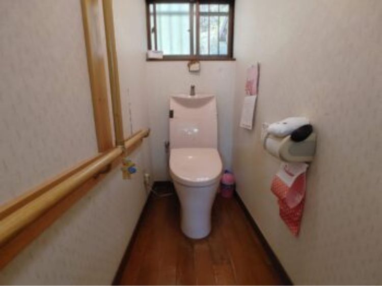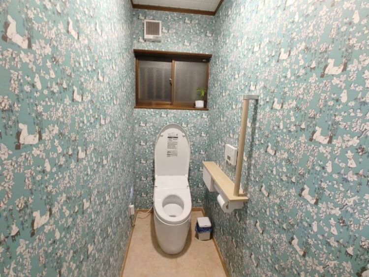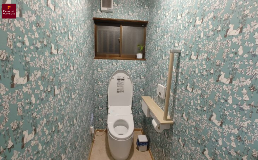 トイレ内はムーミンの可愛いクロスに♪手摺一体型の紙巻器で実用的且つスッキリとした印象になりました。