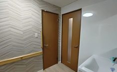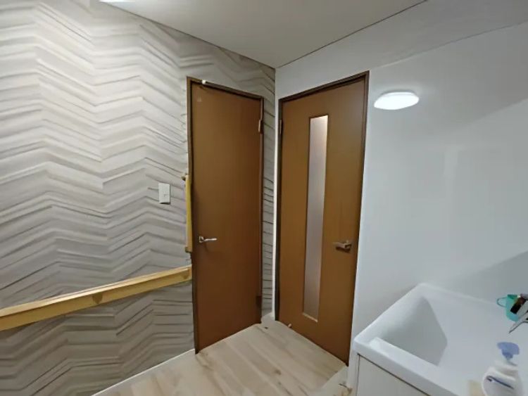 廊下の内装と共にトイレとリビングに入る建具も交換。アクセントのクロスが映えるステキな空間となりました!