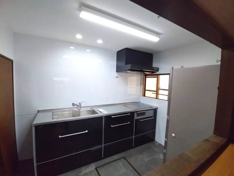 キッチン上のウォールキャビネットは今回はセレクトせずスッキリ♪調理中の手元を照らす灯りとしてダウンライトを新設しました!