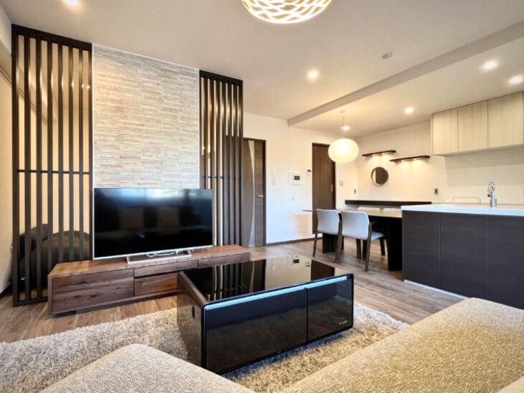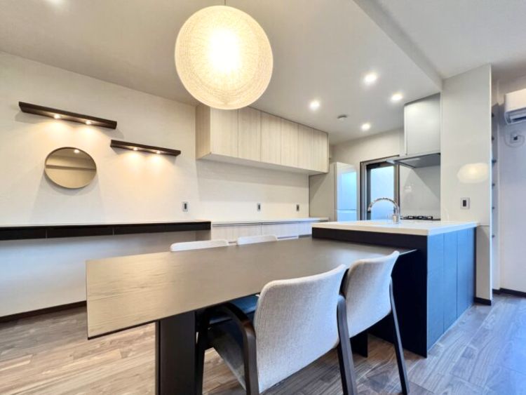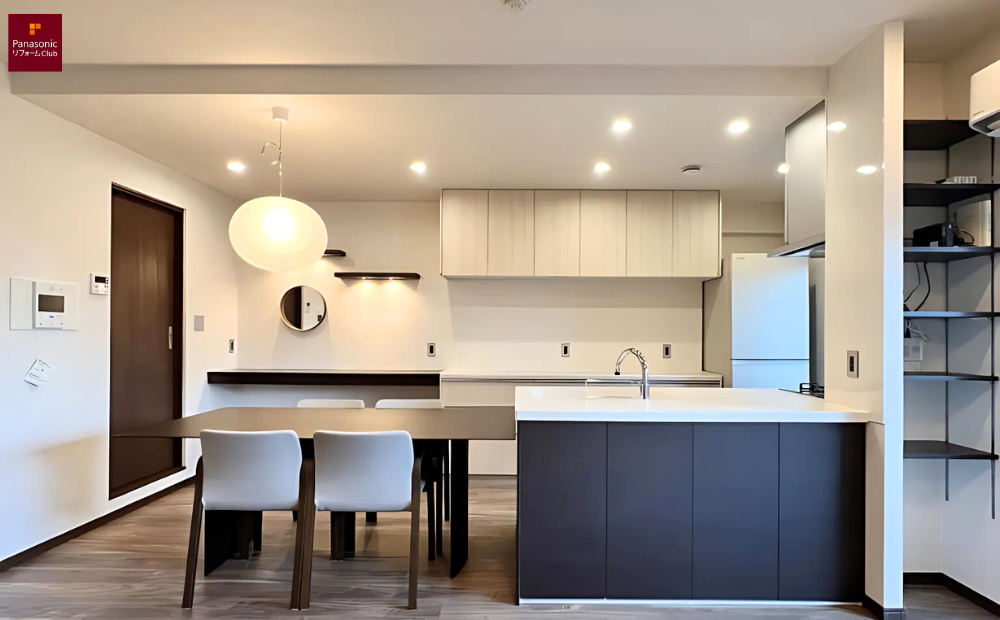 マンションリノベーション事例です。旧LDKに和室1室を加え、ペニンシュラ型キッチンのある広々としたLDKに。